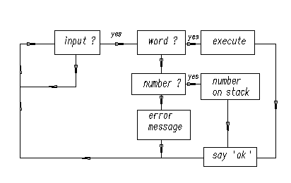 A continuous loop waits for input—from the keyboard, a disk file or whatever—and acts on it according to its nature. Input consists of a sequence of words and numbers. If a name is recognized it is executed; if it is not in the dictionary (where else would you keep a list of words?) Forth tries to convert it to a number and push it on the stack. If this is impossible, Forth aborts execution, issues an error message and waits for more input.